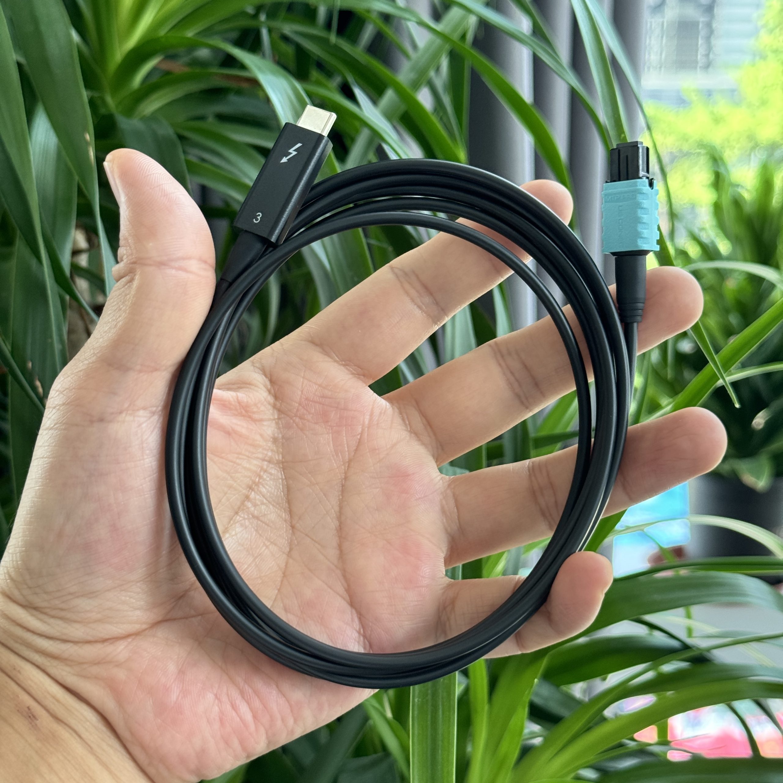 * Overview An optical cable using Thunderbolt technology to deliver great responsiveness with data and display transferring at 40 Gbps in each direction at the same time without sharing of bandwidth between connectors. Can be used for daisy-chaining devices. Low latency with highly accurate time synchronization for professional audio and video applications.