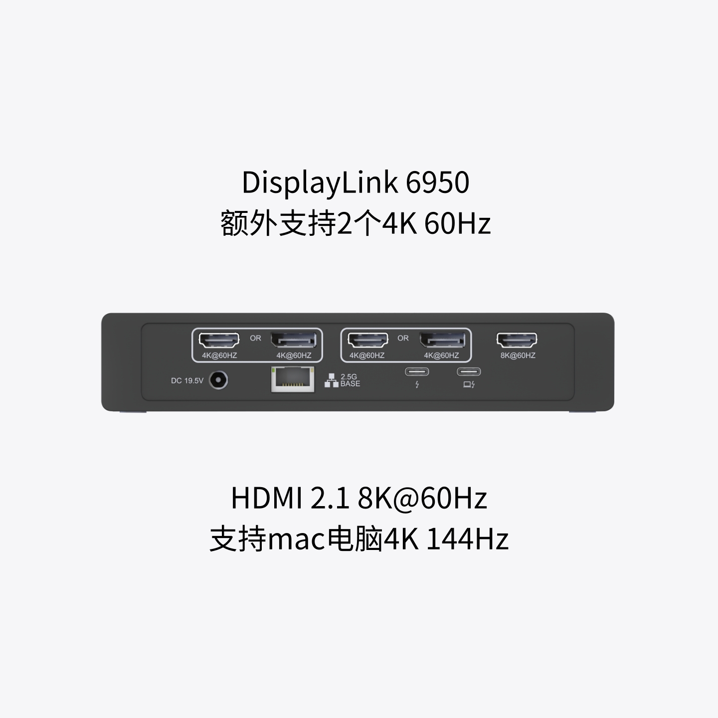 USB-A 3.2 GEN2 10Gbps端口:2个,PD 7.5W HDMI2.1:4K 144hz(Windows&mac 均适用) DisPlaylink 6950:2个白色框框内的分别DP OR HDMI 2选1,支持双屏4K 60hz⚠️需要安装驱动才可以点亮