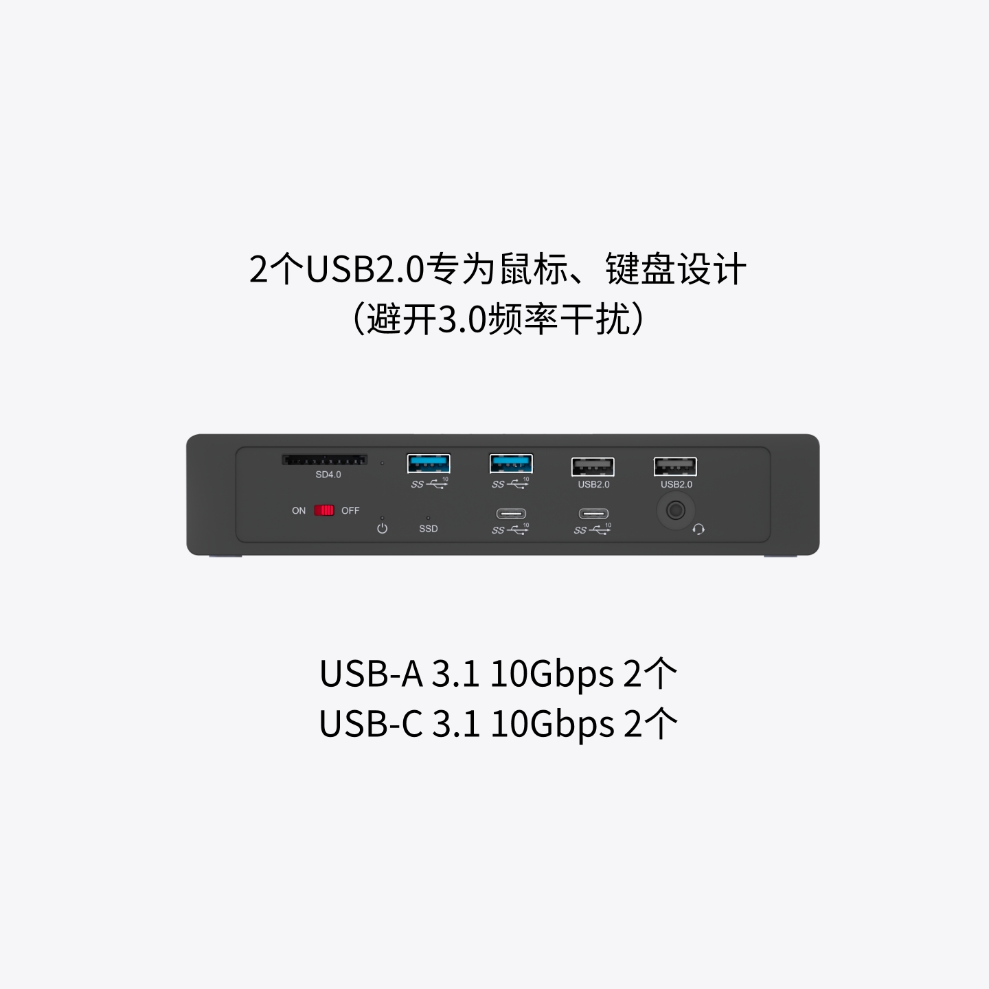 USB3.2 Gen2: 2 个,速率10Gbps ,PD 7.5W USB-A接口: USB-A 2.0 端口 2个,键盘鼠标专用,避开鼠标与USB3.0同频干扰!
