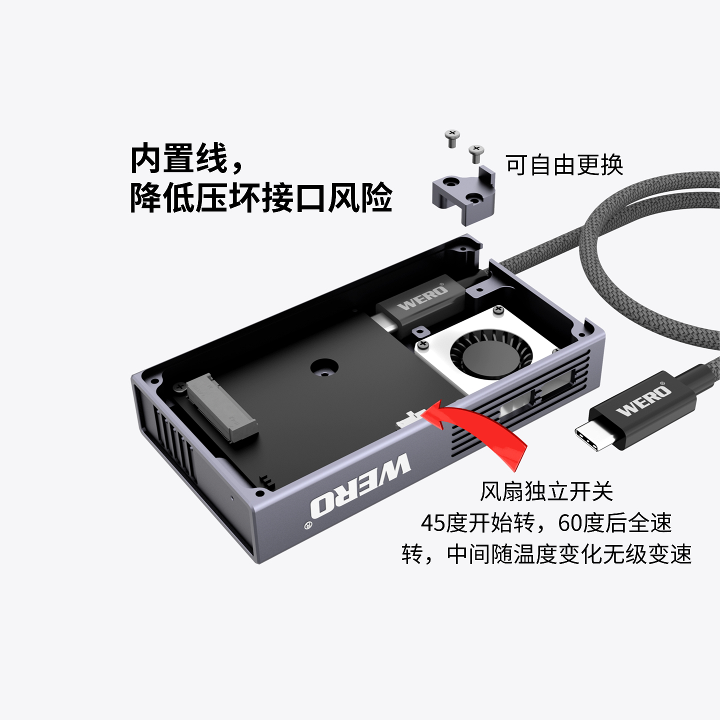 Active Cooling: Temperature-controlled fan. It starts operating at 45°C, runs at full speed when the temperature exceeds 60°C, and adjusts speed steplessly according to temperature changes in between. Equipped with an independent on/off switch for complete quiet operation!