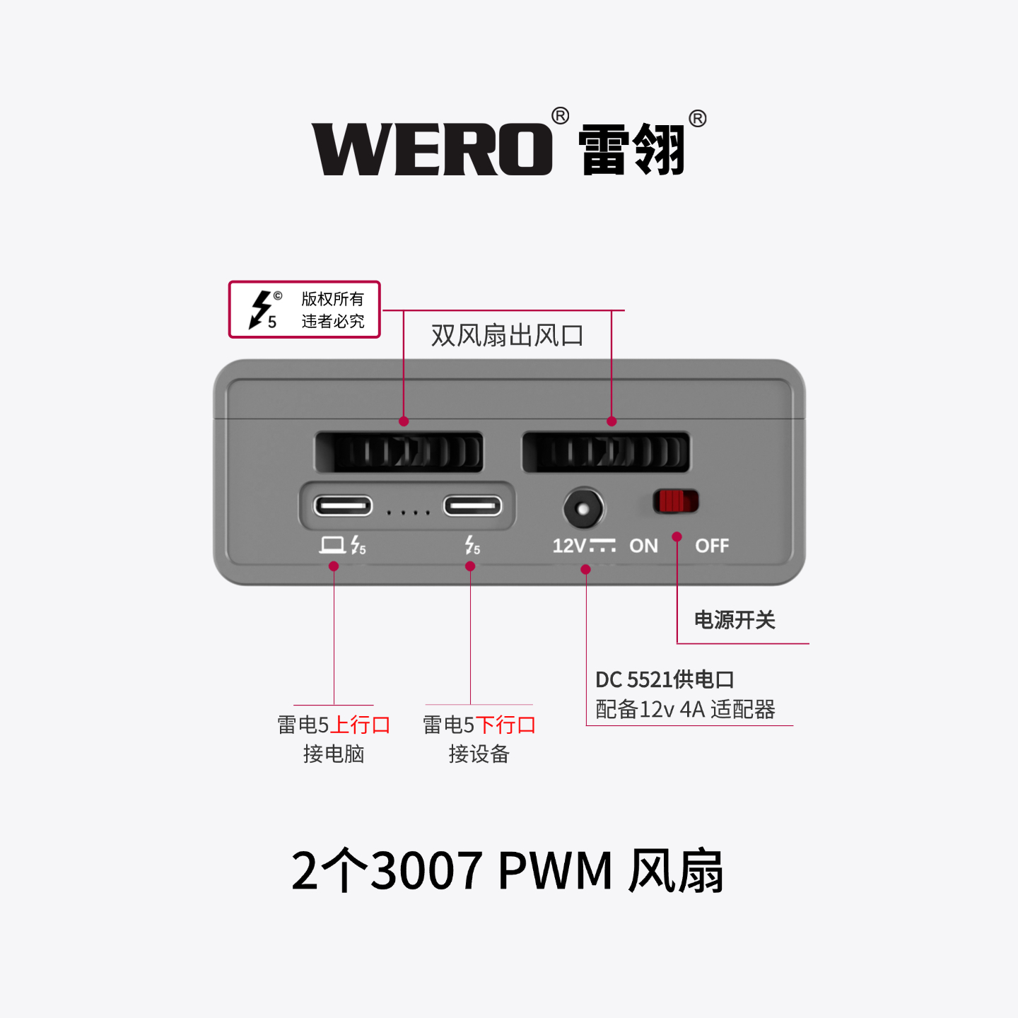 数据线:WERO雷电5线,intel官方认证线,请勿更换成非官方认证线(⚠️注意:号称认证芯片的都是假认证线)!影响稳定性。
